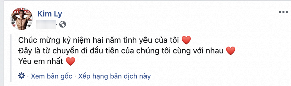 Thế nhưng, vào ngày kỷ niệm hai năm bên nhau, "nữ hoàng giải trí" đã có một hành động hết sức bất ngờ: công khai nhắn nhủ lời yêu thương tới Kim Lý: "2 năm tìm được người bạn tốt đủ để làm mình bình an và cảm thấy ấm áp. Cảm ơn anh nhé Kim Lý". Cô cũng thừa nhận thời gian qua mình không tuyên bố nhưng cũng không che giấu chuyện tình cảm.