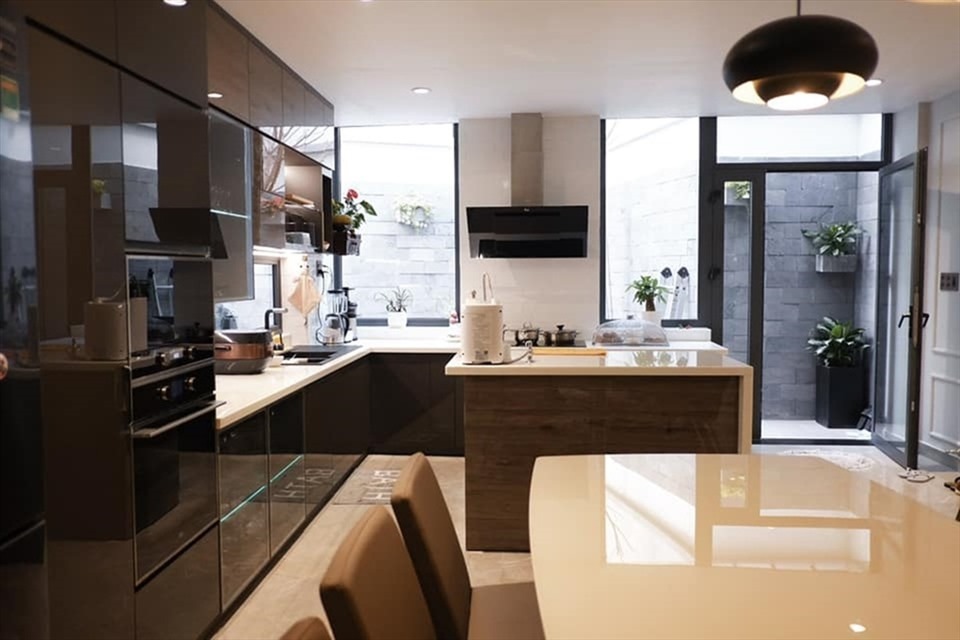 Phòng bếp của căn nhà cũng được thiết kế với tông màu chủ đạo là trắng và đen, nhưng nữ người đẹp vẫn cho điểm nhẹ màu nâu giúp cho không gian thêm phần ấm cúng. Bên ngoài khoảng sân của căn nhà, Bảo Anh cũng cho xây dựng một bể cá koi sang trọng và cực kỳ bắt mắt.