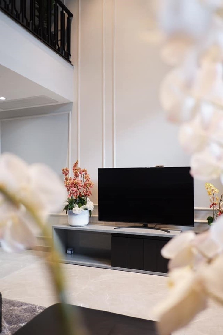 Ngay khi bước vào phòng khách của căn nhà, điều đầu tiên khiến công chúng chú ý chính là bộ ghế sofa đen cực kỳ sang trọng. Căn phòng cũng được chuẩn bị một chiếc tivi cỡ bự để cả gia đình giải trí.