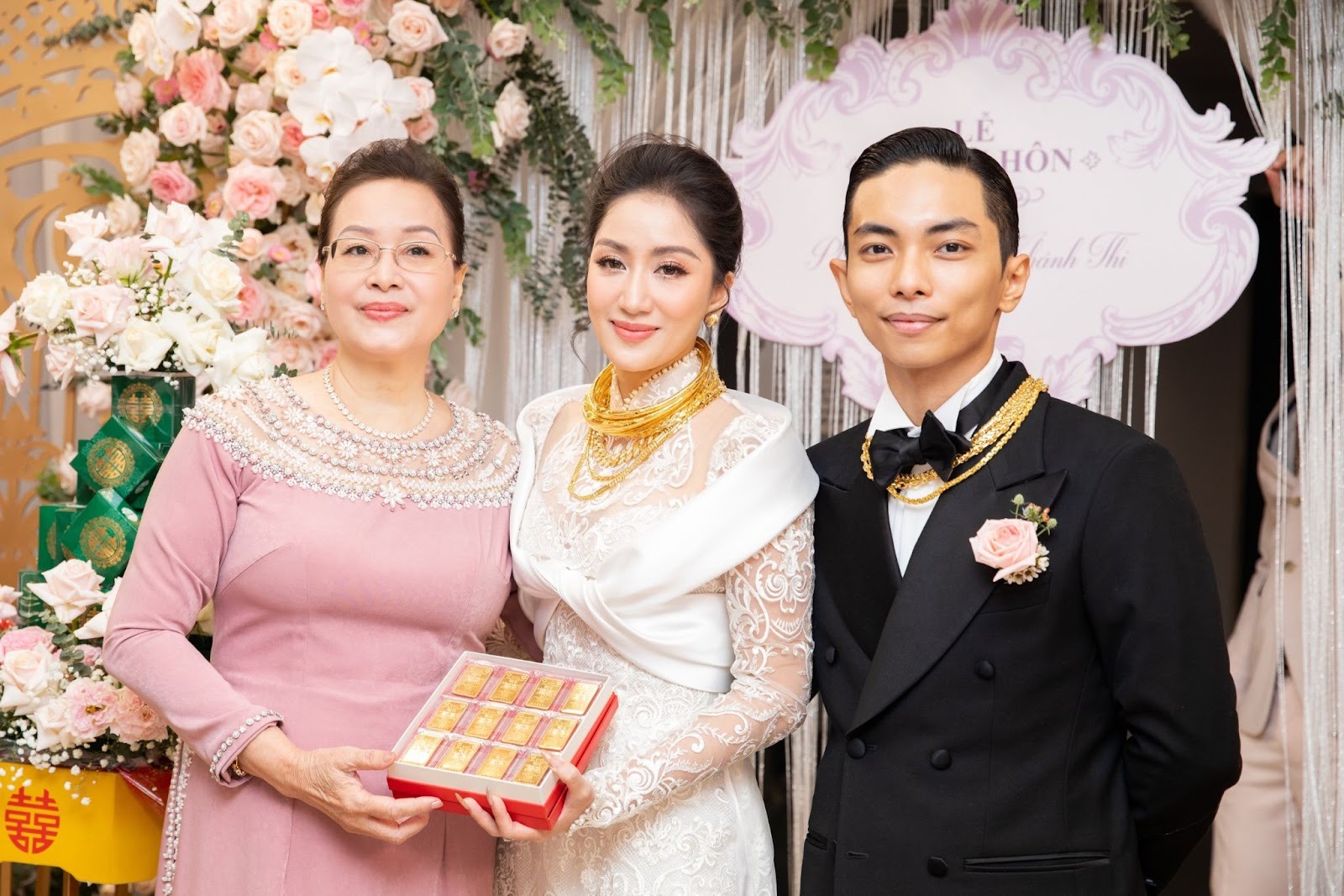 Bên cạnh những lời chúc phúc, khán giả cũng không ngừng trầm trồ trước sính lễ mà Khánh Thi nhận được trong ngày vui của mình. Trong lễ gia tiên, phần trao quà cưới được đại diện gia đình chú rể là bố mẹ Phan Hiển thực hiện theo đúng nghi thức truyền thống. Được biết, sính lễ nhà trai mang qua nhà gái gồm tiền, vàng, các mâm cỗ gồm bánh, trà, rượu,… Đặc biệt, bà ngoại Phan Hiển còn tặng cháu dâu 1 khay tiền mặt toàn tờ mệnh giá 500.000 nghìn đồng và trang sức vàng. Cặp đôi không chia sẻ cụ thể về quà cưới song trong khoảnh khắc hạnh phúc, Khánh Thi đã hé lộ nhận được 10 cây vàng từ nhà chồng.