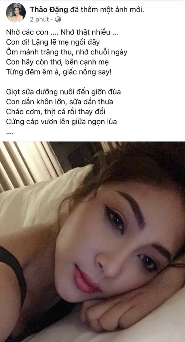 Sau chia sẻ của ông xã, Hoa hậu Đặng Thu Thảo đã có động thái đầu tiên trên MXH. Người đẹp chia sẻ bài thơ nói về nỗi nhớ con và dặn bản thân mạnh mẽ hơn mà không nói gì đến ông xã. Ngoài ra, cô cũng giữ im lặng trước những hình ảnh về người thứ 3 đang được lan truyền.