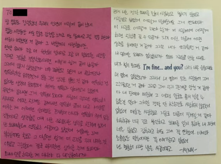 Chồng cũ Kim Sae Ron hé lộ bức thư tay cô viết vào tháng 2 để khẳng định họ từng rất yêu thương nhau, không có chuyện bạo hành, thao túng như tin đồn. Họ thu hút lẫn 1 cách đầy mãnh liệt, vội vàng kết hôn nhưng sau đó cùng tìm cách hủy bỏ hôn nhân bởi những khác biệt về khoảng cách địa lý, tính cách. Nội dung bức thư do Kim Sae Ron viết như sau: