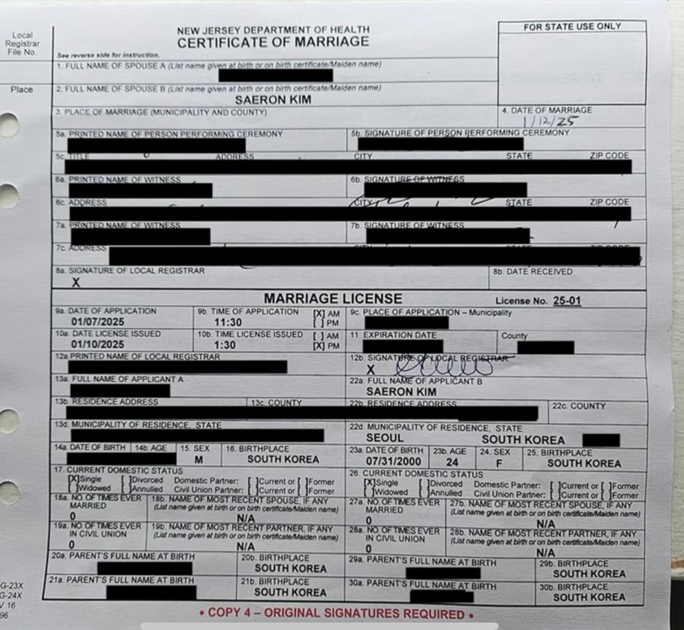 Người này nói thêm: "Vào khoảng giữa tháng 11/2024, tôi được một người quen giới thiệu và đã gặp Kim Sae Ron. Dù thời gian quen biết ngắn ngủi, nhưng giữa chúng tôi đã có sự thu hút rất mạnh mẽ, và vì thế, vào ngày 12/1/2025, tôi và cô ấy đã làm thủ tục kết hôn tại Mỹ, nơi tôi đang sinh sống, chỉ có sự hiện diện của những người làm chứng. Vâng, ngày hôm đó đúng là ngày chúng tôi kết hôn.