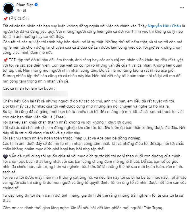 Trong bài đăng này, Phan Đạt cũng chia sẻ đoạn tin nhắn tới NSƯT Hữu Châu vì cho rằng, bài đăng không nêu tên trước đó đã vô tình làm ảnh hưởng tới nam nghệ sĩ.