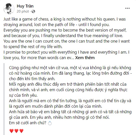 Ngay sau đó ít phút, nam doanh nhân tiếp tục chia sẻ bài viết thứ 2 với lời lẽ hết sức ngọt ngào. Huy Trần viết: "Cũng giống như một ván cờ vua, một vị vua không là gì nếu không có nữ hoàng của mình. Anh đã lang thang, lạc lõng trên đường đời - cho đến khi tìm thấy em.