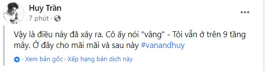 Họ đã có một happy ending vì anh ấy đã cầu hôn cô ấy. Và cô 'say Yes'. Cô gái ấy chính là Vân, người đang viết những dòng này cho bạn. Vân đang rất hạnh phúc và Vân muốn chia sẻ điều ấy với bạn. Mong bạn sẽ chúc phúc cho Vân và Huy Trần trong hành trình mới này nhé!''.