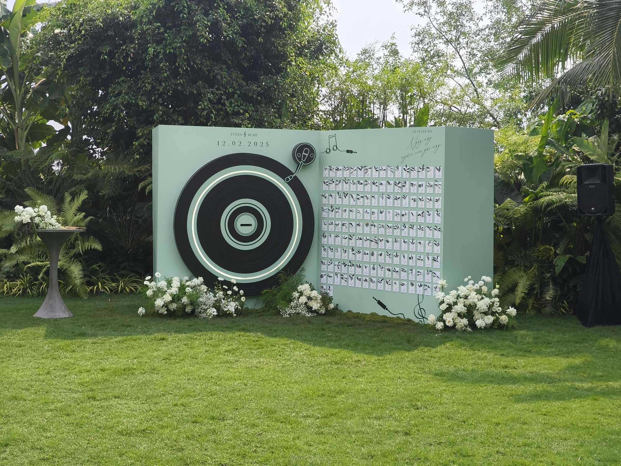 Trước đó, những hình ảnh đầu tiên từ địa điểm tổ chức đã khiến cộng đồng mạng xuýt xoa vì concept độc đáo, mang đậm dấu ấn cá nhân của giọng ca Từng Là. Lấy cảm hứng từ niềm đam mê âm nhạc, Vũ Cát Tường đã biến không gian lễ thành đôi thành một bữa tiệc nghệ thuật với tâm điểm là chiếc bàn chạy đĩa than (vinyl) khổng lồ, thiết kế cách điệu với danh sách khách mời đi kèm. Đây không chỉ là điểm nhấn ấn tượng mà còn thể hiện trọn vẹn con đường nghệ thuật của Vũ Cát Tường.