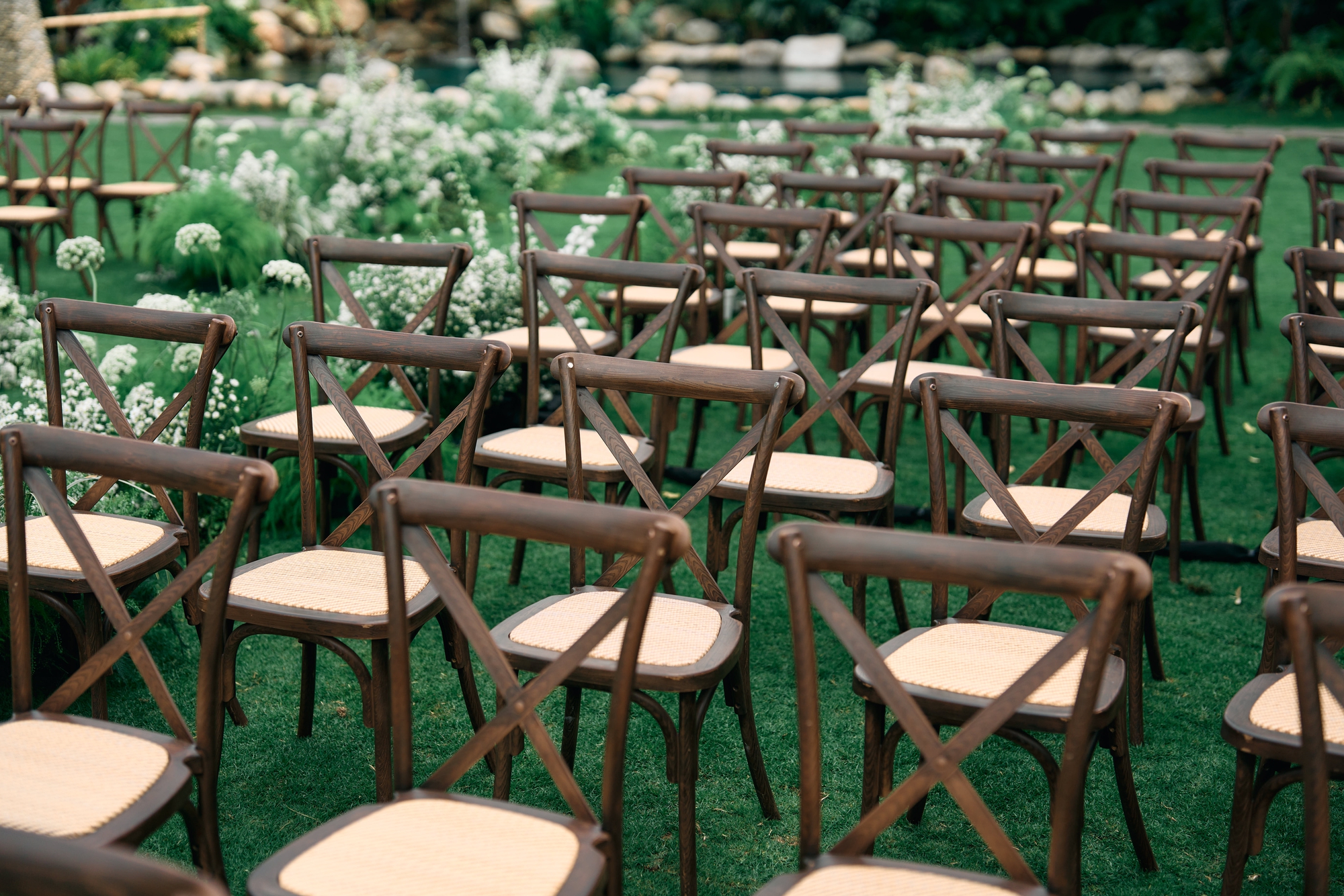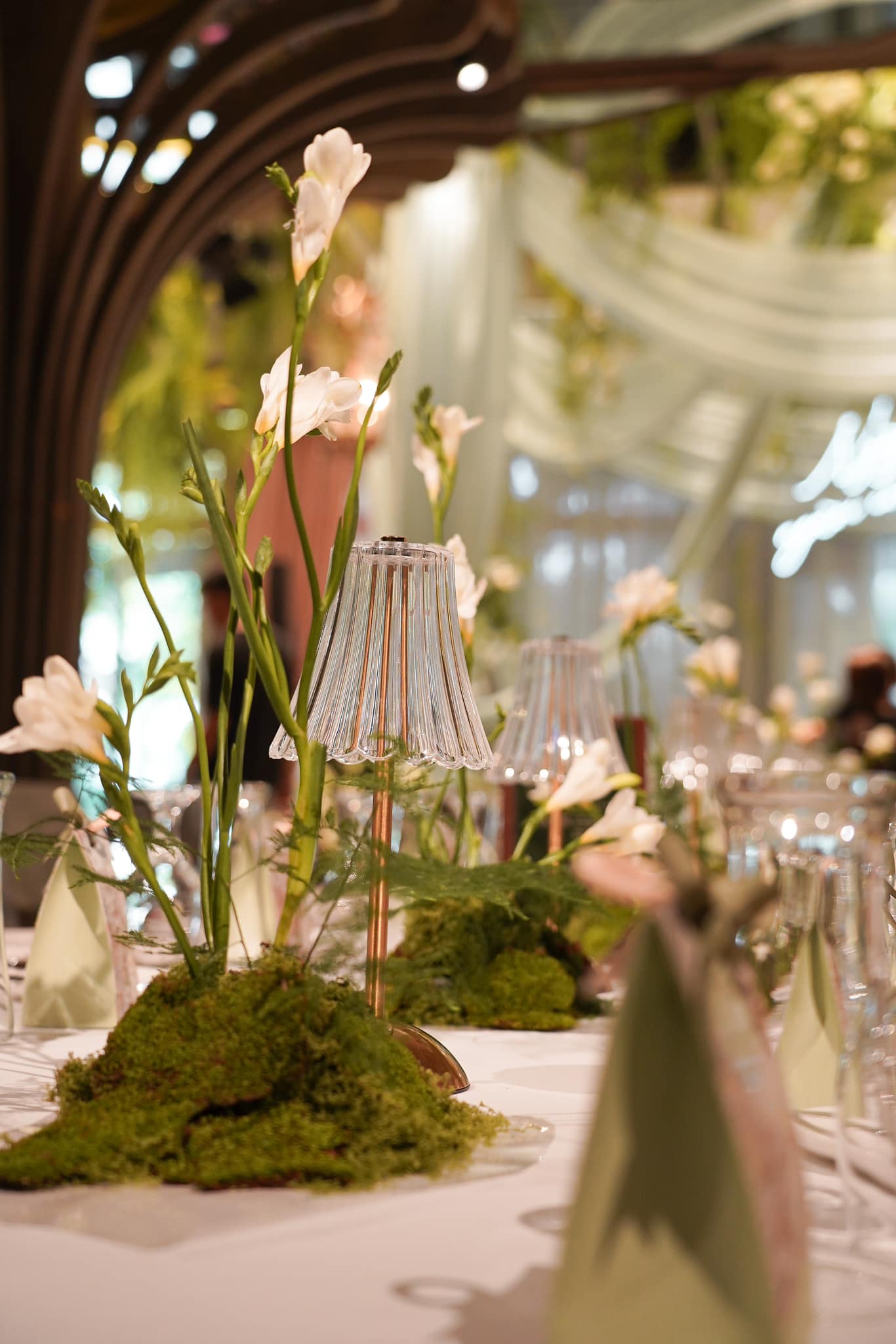 Bên trong khu vực tổ chức tiệc, Vũ Cát Tường và bạn đời tiếp tục mang đến một không gian đầy nghệ thuật với thiết kế bàn dài sang trọng. Những dãy bàn được sắp xếp đối xứng, ghế gỗ mang phong cách rustic gần gũi nhưng vẫn đẳng cấp.