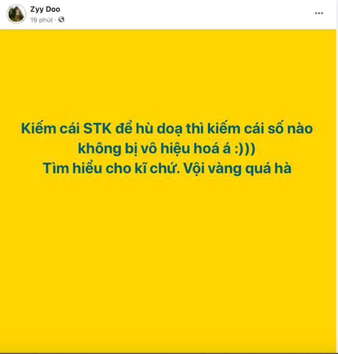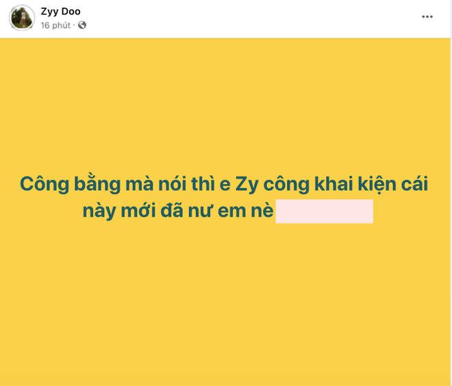 Trên trang cá nhân, Zyy Doo liên tục đăng tải những status có nội dung như: "Câu chuyện chị đưa ra nó hong có thuyết phục", "Tôi chờ ngày này lâu lắm rồi", "Sẵn sàng đối chứng với pháp luật nếu tin nhắn tống tiền là từ tôi", "Công bằng mà nói thì em Zyy công khai kiện cái này mới đã nư em nè"...