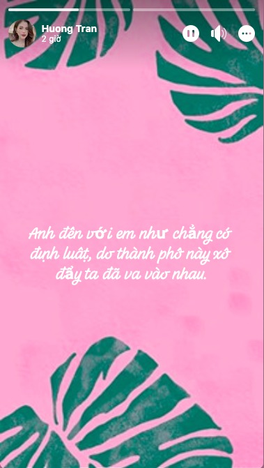 Mới đây, Hương Trần bất ngờ đăng tải những dòng tâm sự về chuyện tình cảm khiến dân mạng không khỏi tò mò. Điều đáng nói, thay vì những lời triết lý đậm chất buồn bã về cuộc sống như suốt thời gian qua cô đã viết, vợ cũ Việt Anh lại thể hiện sự bồi hồi xen lẫn nhẹ nhàng của một người đang yêu đơn phương. Cô chia sẻ: "Yêu đơn phương giống như bước trên cát. Bước rất nhẹ nhưng vết lún rất sâu, anh đến với em như chẳng có định luật, do thành phố xô đẩy ta đã va vào nhau".