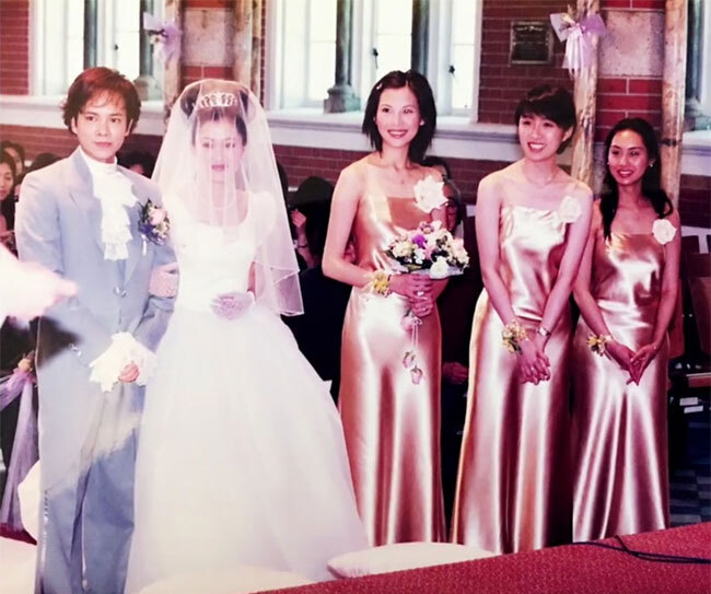 Lương Tiểu Băng cũng chia sẻ bức ảnh mặc váy cưới dài tha thướt, sánh bước cùng ông xã lên lễ đường. Phù dâu của cô khi đó là các chị em thân thiết trong TVB như Thái Thiếu Phân, Chu Nhân.... Các phù dâu mặc váy màu champagne, ai nấy đều cười rạng rỡ. Tất cả các cô gái khi đó đều còn rất trẻ và xinh đẹp.