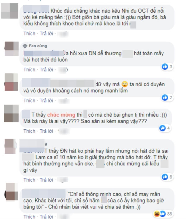 Cư dân mạng đã để lại rất nhiều lời bình luận thể hiện sự bức xúc trước những chia sẻ của Dương Yến Ngọc: "Ta nói có duyên và vô duyên khoảng cách mong manh lắm", "Hồi xưa Đông Nhi dễ thương, hát toàn mấy bài hot thời đó luôn", "Sao sân si kém sang vậy? Chị chúc mừng kiểu gì vậy?..."