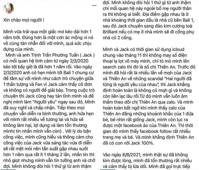 Theo đó, vào đầu tháng 8/2021, trên mạng xã hội xuất hiện bài viết cô gái tên T.V tố Jack "bắt cá hai tay". Trong bài đăng khi đó, cô này cho biết đã bắt đầu quan hệ yêu đương với nam ca sĩ từ tháng 3/2020. Vì cả hai dùng chung icould nên T.V vô tình thấy số điện thoại lạ, tra cứu trên Zalo thì phát hiện đó là thông tin của diễn viên Thiên An. Sau đó, cô nhiều lần hỏi Jack nhưng đều nhận được lời phản hồi khẳng định anh và Thiên An không có mối quan hệ gì đặc biệt. Tuy nhiên, thông qua cuộc trò chuyện riêng, T.V biết Jack và Thiên An đã có một cô con gái chung.
