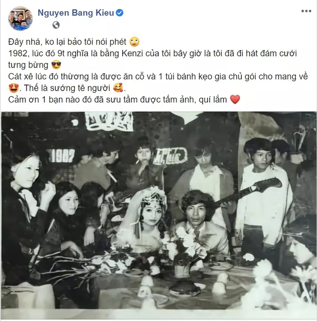Đặc biệt, Bằng Kiều cũng hài hước tiết lộ cát xê thời điểm cách đây gần 40 năm: "Cát xê lúc đó thường là được ăn cỗ và 1 túi bánh kẹo gia chủ gói cho mang về. Thế là sướng tê người. Cảm ơn một bạn nào đó đã sưu tầm được tấm ảnh, quý lắm".