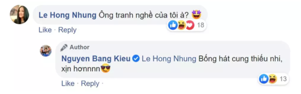 Bên dưới phần bình luận, "chị Bống" Hồng Nhung hay Hương Tràm cũng không giấu được sự thích thú với tấm ảnh cực hiếm của nam ca sĩ Bằng Kiều. Hương Tràm trêu đàn anh ngay từ tấm bé đã biết chọn cô dâu xinh để trổ tài năng ca hát. Trong khi đó, ca sĩ Hồng Nhung còn hài hước nói Bằng Kiều "tranh nghề".