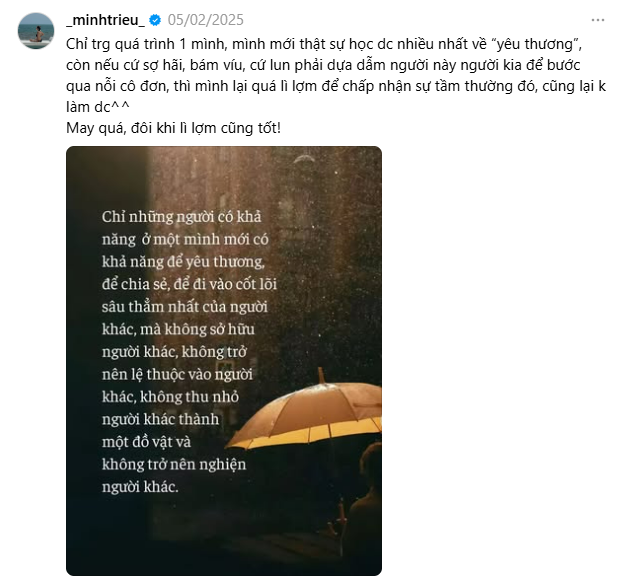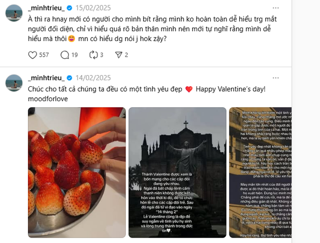 Mới đây, siêu mẫu Minh Triệu gây lo lắng khi liên tục có những hành động khác lạ. Theo đó trong thời gian qua, người đẹp sinh năm 1988 ít có chia sẻ mới trên mạng xã hội Threads. Phần lớn các bài đăng của Minh Triệu là những dòng chú thích đầy tâm trạng, nhiều suy tư: "Trong tình yêu không có chỗ cho sự cẩu thả. Cuộc sống không cần phải quá giàu có để làm được điều này, nó chỉ là về mức độ chú tâm của bạn là bao nhiêu cho mối quan hệ", "Đừng bao giờ vì bảo vệ cái tốt của mình rồi lại đi gây hại cho người khác. Lạc lối trong bóng tối, ít nhất còn cố nhìn đâu đó có tý ánh sáng mà hướng đến. Còn lạc lối trong ánh sáng thì không có điểm tựa nào để hướng đến cả"...