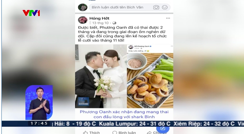Trong đó, Phương Oanh được VTV điểm danh là nạn nhân của những hội nhóm hóng hớt, bóc phốt giới giải trí thu hút hàng trăm nghìn lượt theo dõi. "Người nổi tiếng trở thành đối tượng bị săn lùng thông tin như chuyện tình của diễn viên này (Phương Oanh - PV) được cộng đồng mạng quan tâm đến mức lập riêng hội nhóm với 10.000 thành viên, xây dựng các tập phim để bàn luận, đa phần là mỉa mai và chỉ trích", trích bình luận của phóng sự.
