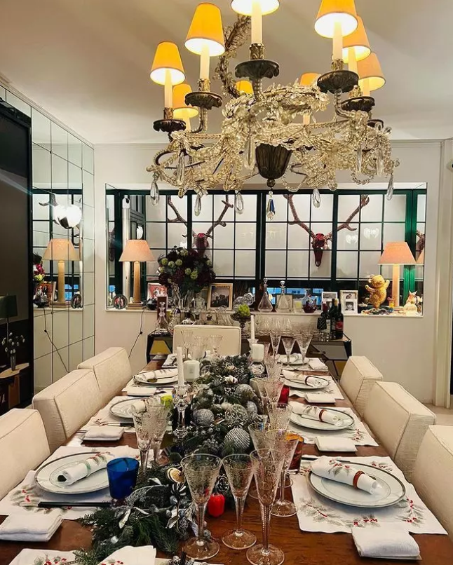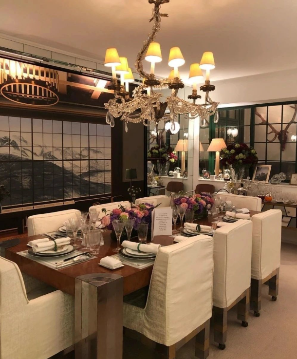 Chiếc đèn chùm trên bàn ăn nhìn qua cũng biết là cực đắt đỏ. Phía sau phòng ăn là một bức tranh ghép lớn về cảnh núi tuyết. Căn phòng này chẳng kém gì các khách sạn 5 sao.