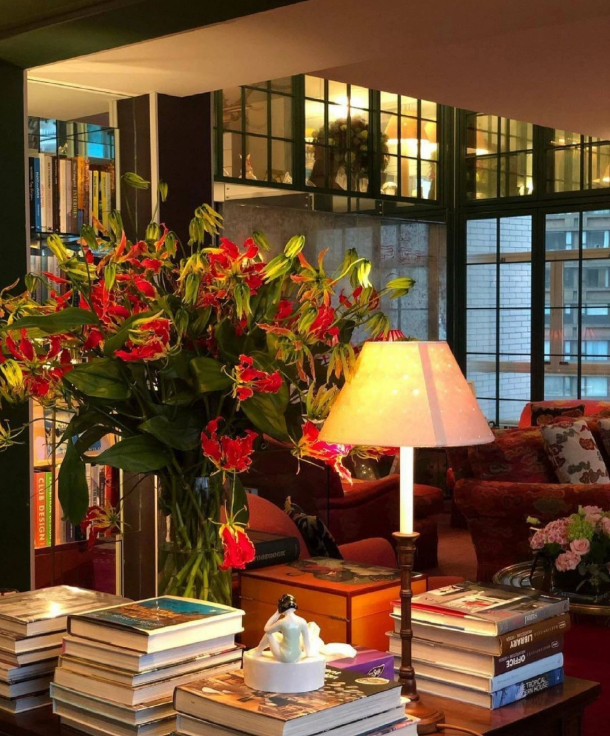 Có một bộ sofa thoải mái cùng với một chiếc ghế đơn, sau giờ làm việc, cô có thể ngồi hoặc nằm xuống nghỉ ngơi. Trên bàn làm việc, ngoài sách còn có hoa tươi tạo ra một bầu không khí rất dễ chịu.