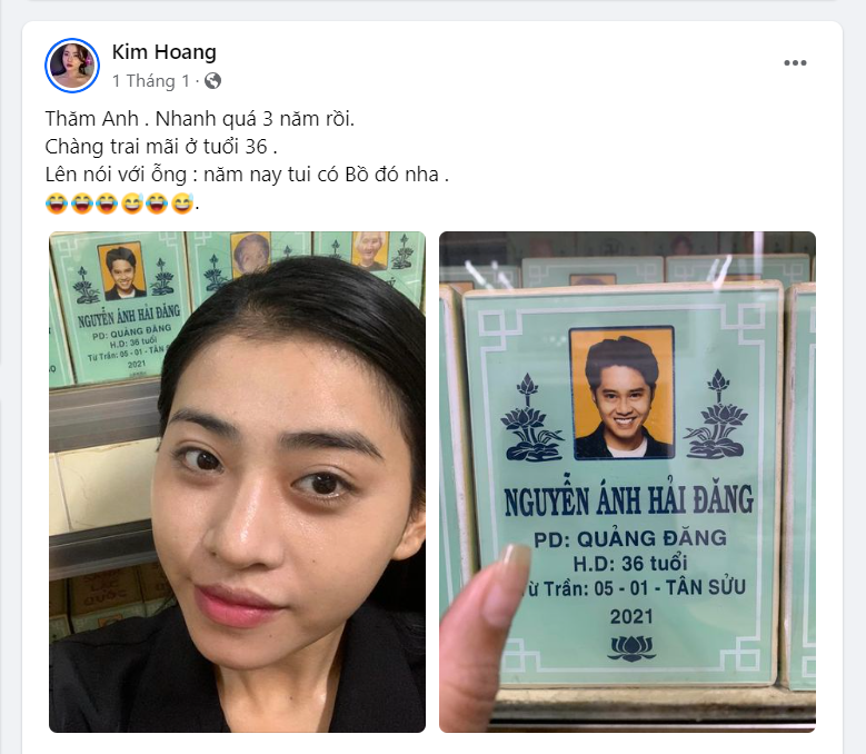 Sau 3 năm, Kim Hoàng đã ổn định cuộc sống cũng như tinh thần nhưng vẫn không quên bạn trai quá cố. Thỉnh thoảng, cô lại lên mộ thăm bạn trai nhưng thay vì những dòng trạng thái buồn bã, nữ diễn viên chọn cách chia sẻ dí dỏm và bình thản hơn.