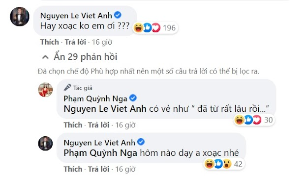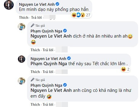 Trên mạng xã hội, cặp đôi cũng thường xuyên tương tác. Mỗi khi Quỳnh Nga đăng ảnh khoe sắc vóc quyến rũ, Việt Anh không ngớt lời khen ngợi, đôi lần còn có những nhận xét ẩn ý khiến khán giả cho rằng cả hai "thả thính" qua lại. Lúc thì anh khen Quỳnh Nga có hàng mi đẹp, lúc thì khen thân hình cô ngày càng "phổng phao",... Thậm chí cả hai có những lời đối đáp khiến netizen "đỏ mặt".