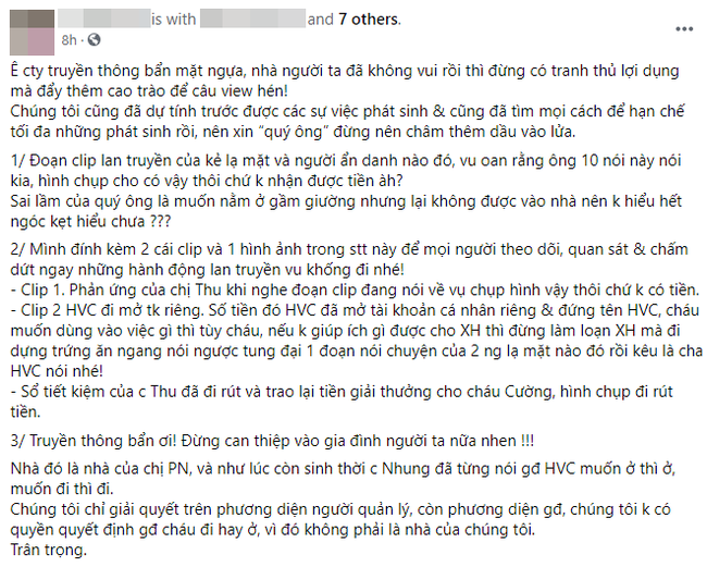 Phía ekip Phi Nhung chia sẻ: "Mình đính kèm 2 cái clip và 1 hình ảnh trong bài đăng này để mọi người theo dõi, quan sát và chấm dứt ngay những hành động lan truyền vu khống đi nhé! Clip 1. Phản ứng của chị Thu khi nghe đoạn clip đang nói về vụ chụp hình vậy thôi chứ không có tiền. Clip 2, Hồ Văn Cường đi mở tài khoản riêng. Số tiền đó Hồ Văn Cường đã mở tài khoản cá nhân riêng và đứng tên Hồ Văn Cường, cháu muốn dùng vào việc gì thì tùy cháu".