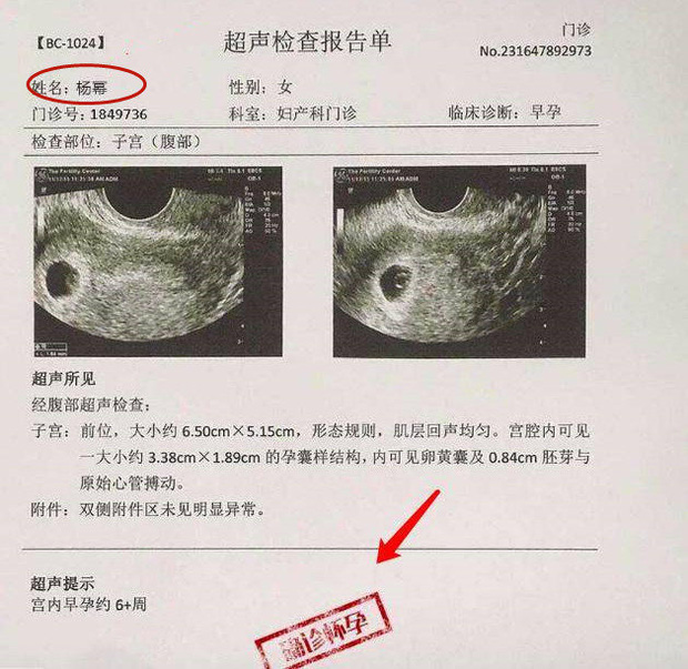 Để làm cho tin đồn thuyết phục hơn, blogger này còn chia sẻ thêm một hình ảnh mà dân mạng xứ Trung từng bàn tán xôn xao một thời gian, đó là tờ giấy siêu âm kèm theo con dấu đỏ "Xác nhận mang thai" có ghi tên Dương Mịch trên đó.