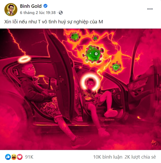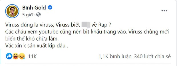 Ngoài ra, Bình Gold còn nhắc đến tính lăng nhăng được dân tình chia sẻ lại nhiệt tình: “Bịt khẩu trang vào nhé! Dịch đang căng đấy! Chúng m** bắn thẳng sang nhà anh đi, đừng có chạy lăng nhăng nữa".