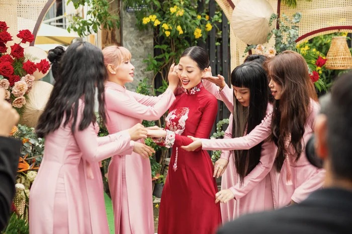 Hình ảnh này như tái hiện lại 1 nét đẹp riêng của Sài Gòn xưa, là hình ảnh quen thuộc nhưng vô cùng mộc mạc gần gũi từ người dân bình thường cho đến những người giàu có của hòn ngọc Viễn Đông. Ở bên đàng gái, diễn viên Khả Như, MC Kiwi Kim Quý, MC Hồng Trang, nhiếp ảnh gia Phương Thanh… cũng có mặt với cách phụ dâu để chào đón họ nhà trai. Sau khi hoàn thành những nghi thức chính, “cô dâu” Hà Trinh xuất hiện chào họ hàng 2 bên gia đình.