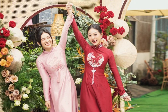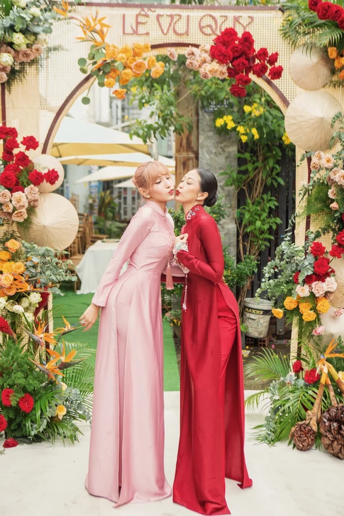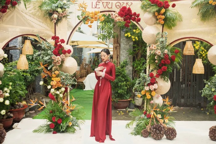 Liêu Hà Trinh chọn tone trang điểm trầm đỏ, nổi bật trong chiếc áo dài đỏ làm tôn lên vẻ đẹp kiêu sa. Chiếc áo dài mà nữ MC lựa chọn xuất hiện trong lễ gia tiên cũng mang ý nghĩa đặc biệt. Vẫn là hình ảnh áo dài được thêu Long – Phụng quen thuộc với sắc đỏ tượng trưng cho điềm may mắn, biểu tượng hạnh phúc, nhưng trang phục của “cô dâu” Hà Trinh lại lấy cảm hứng từ tà áo dài cung đình của Nam Phương Hoàng Hậu, có áo choàng khoác ngoài và đội mấn.