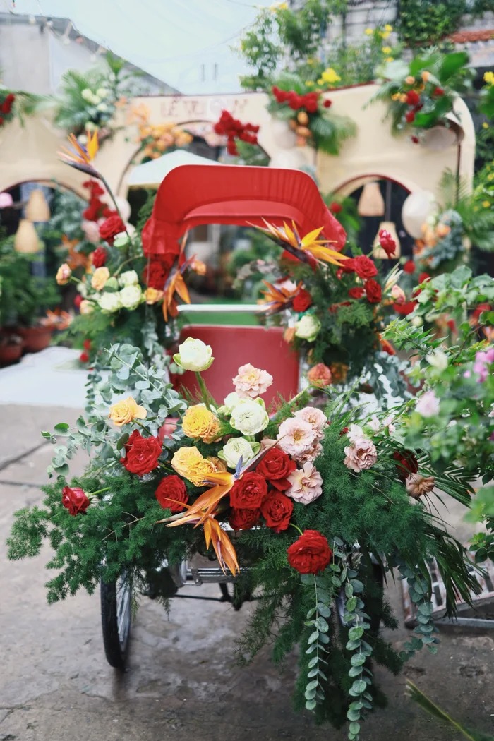 Đúng 9h sáng, “chú rể” Anh Khoa cùng dàn phụ rể “soái ca” (Otis, MC Tài Danh…) đã có mặt trước con hẻm dẫn đến tư gia nhà cô dâu. Không phải trên những chiếc siêu xe đắt tiền, được trang trí hoa như lễ rước dâu thông thường, hình ảnh chú rể cùng họ hàng nhà trai xuất hiện trên những chiếc xích lô, nối đuôi nhau bưng theo dàn tráp lễ vật… đã trở thành “điểm nhấn” đặc biệt trong ngày vui.