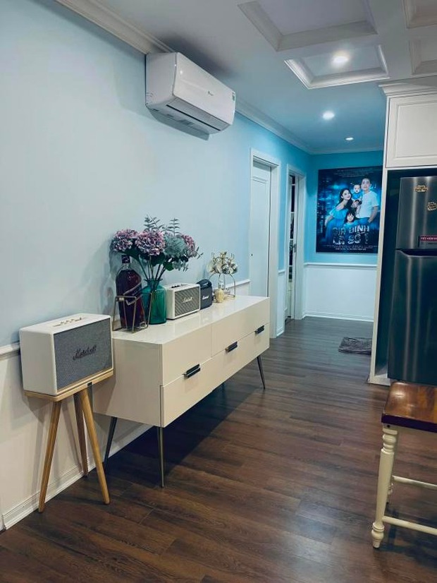 Căn chung cư có tone màu trắng - xanh dương làm chủ đạo, nội thất hiện đại và được vợ chồng trẻ đầu tư chỉn chu.