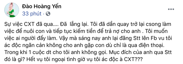 Nguyên văn chia sẻ của Hoàng Yến như sau: "Sự việc Cao Xuân Thắng đã qua… đã lắng lại. Tôi đã dần quay trở lại cuộc sống làm việc để nuôi con và tiếp tục kiếm tiền để trả nợ cho anh. Tôi muốn việc ai người đấy làm. Vậy mà sáng nay anh lại đăng status lên Facebook vu tôi ác độc ngăn cản không cho anh gặp con dù chỉ là qua điện thoại. Trong khi 1 cuộc điện thoại cho tôi anh không gọi. Mục đích của anh qua status đó là gì? Hết vụ tôi ngoại tình giờ vụ tôi ác độc à Cao Xuân Thắng?".