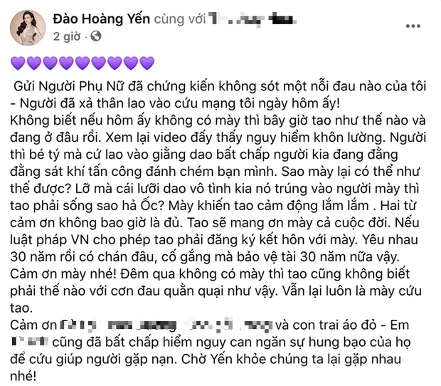 29/06/2021 18:30'Cô Xuyến' Hoàng Yến viết tâm thư cảm ơn người bạn đã xả thân cứu mình lúc bị chồng cũ truy sát, khẳng định sẽ cưới ngay nếu được cho phép