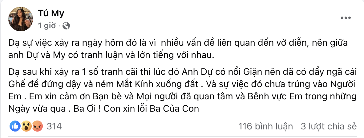 Cụ thể, Tú My xác nhận giữa cô và Minh Dự đã xảy ra tranh luận căng thẳng liên quan đến vấn đề vở diễn, dẫn đến cả hai lớn tiếng với nhau. Trong bài đăng, Tú My cho biết Minh Dự khi đó có giận dữ, đứng dậy, đẩy ghế và ném kính xuống đất. Tuy nhiên, cô nhấn mạnh hành động này không trực tiếp tác động đến cô mà chỉ là phản ứng trong lúc căng thẳng. Đồng thời, Tú My gửi lời cảm ơn đến bạn bè và mọi người đã quan tâm, bảo vệ cô trong những ngày qua.