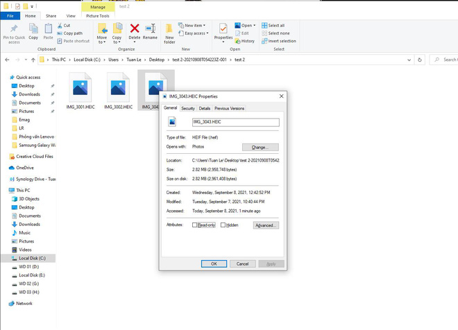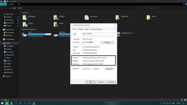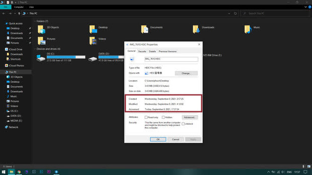 Ở đây, chúng ta sẽ xem qua thông tin tệp của tệp tin có tên "IMG_7610.HEIC". Có thể thấy được toàn bộ thông tin về tệp tin kể trên như ngày được tạo trên hệ thống, thời điểm chỉnh sửa cuối cùng và thời điểm truy cập cuối cùng.