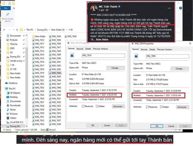 Theo đó, Trấn Thành khẳng định trong bài đăng của mình rằng thời gian nhận được tài liệu sao kê từ ngân hàng là vào sáng ngày 7/9 theo giờ Việt Nam. Tuy nhiên, trong hình ảnh bên dưới, cộng đồng mạng đã chỉ ra việc file ảnh này đã bị chỉnh sửa vào khoảng 2h50 sáng ngày 7/9 (hình ảnh bên dưới).