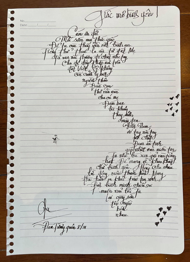 Chiều ngày 28/8, Đàm Vĩnh Hưng khoe bài thơ viết theo hình chữ S với mục đích cổ vũ tinh thần người dân Việt Nam đã được nhạc sĩ Hoài Phương phổ nhạc. Nam ca sĩ nhấn mạnh anh chỉn chu đến từng chi tiết nên phải viết rất nhiều bản nháp: "Cảm động quá. Hưng ngồi dậy viết thêm vài câu cho đủ để làm bài hát tròn trịa hơn. Đây, Hưng cũng ít có siêng lắm. Ngồi viết có nhiêu tờ chứ nhiêu. Cái thì chữ không đều, cái thì khoảng cách không ổn, cái thì này cái thì kia. Canh miết mới được như vầy".