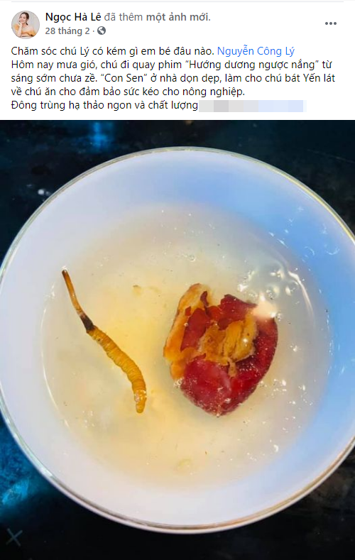 Bên cạnh đó, chế độ dinh dưỡng của Công Lý cũng được vợ hỗ trợ nghiêm ngặt. Có lúc Công Lý tiết lộ bữa ăn của mình là salad rau tốt cho sức khỏe, nhưng lúc anh bận rộn quay phim thì Ngọc Hà lại chưng yến với đông trùng hạ thảo để bồi bổ cho chồng.