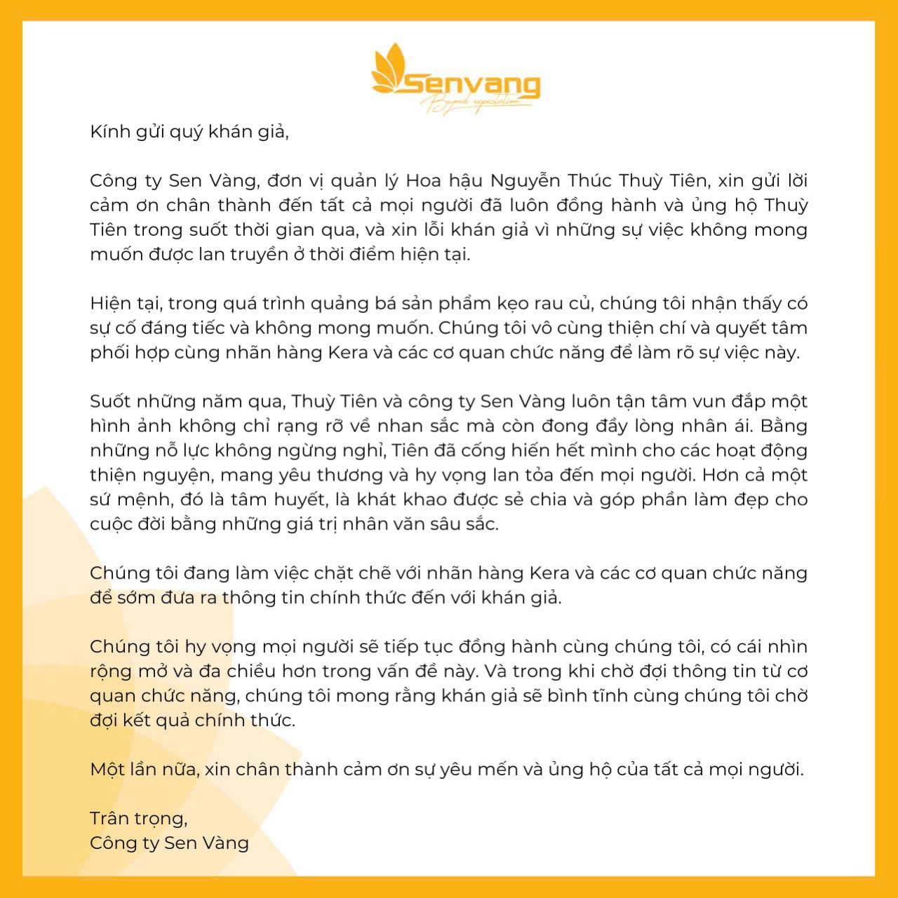 Tối 12/3, Công ty Sen Vàng – đơn vị quản lý của Hoa hậu Nguyễn Thúc Thùy Tiên – đã chính thức lên tiếng về vụ việc liên quan đến quảng cáo sản phẩm kẹo rau củ Kera. Trong thông báo được đăng tải, phía công ty đã gửi lời xin lỗi đến khán giả và thừa nhận đây là sự cố đáng tiếc, không mong muốn.