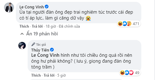Ở diễn biến mới nhất, sau rất nhiều suy đoán, Công Vinh đã đích thân đưa ra lý do cho biểu cảm khó hiểu của mình. Anh bình luận ngay dưới clip mà Thủy Tiên đăng tải: "Ủa tại người đàn ông đẹp trai nghiêm túc trước cái đẹp có tí áp lực... Làm gì căng dữ vậy". Rất nhanh chóng, nữ ca sĩ cũng đáp lại chồng: "Hình như tôi chiều ông quá rồi nên ông hư phải không?".