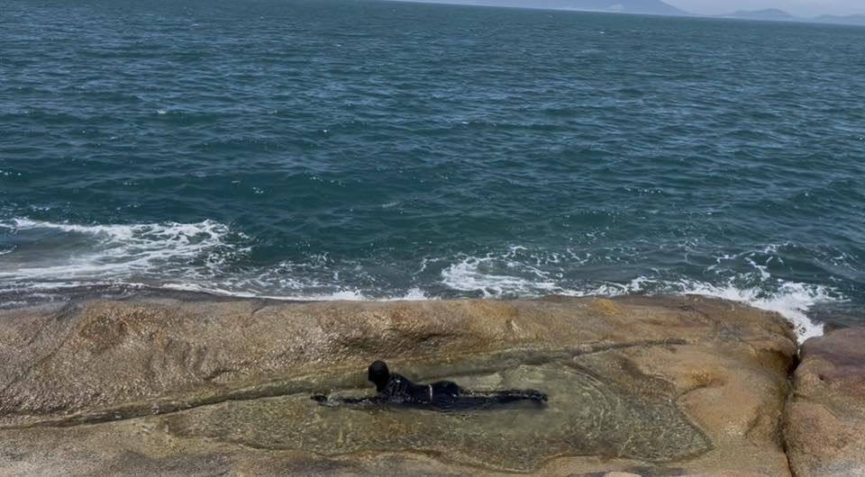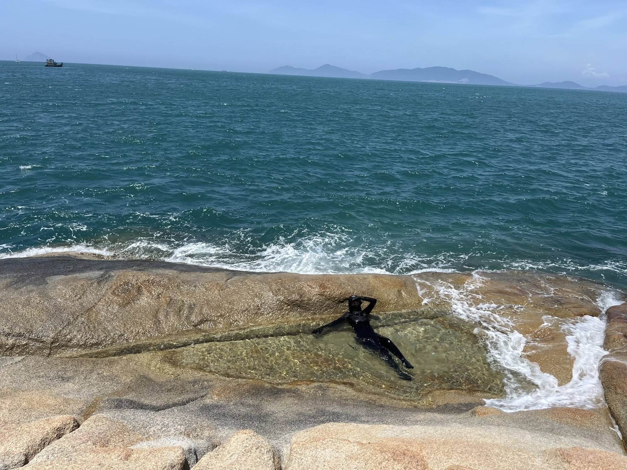 Nam cầu thủ viết: "Cách tôi và vợ tôi đi biển". Theo hình ảnh, Công Vinh thoải mái cởi trần tắm biển còn vợ anh ca sĩ Thủy Tiên bịt kín, đen xì từ đầu tới chân đang ngâm trong nước biển trong vắt.