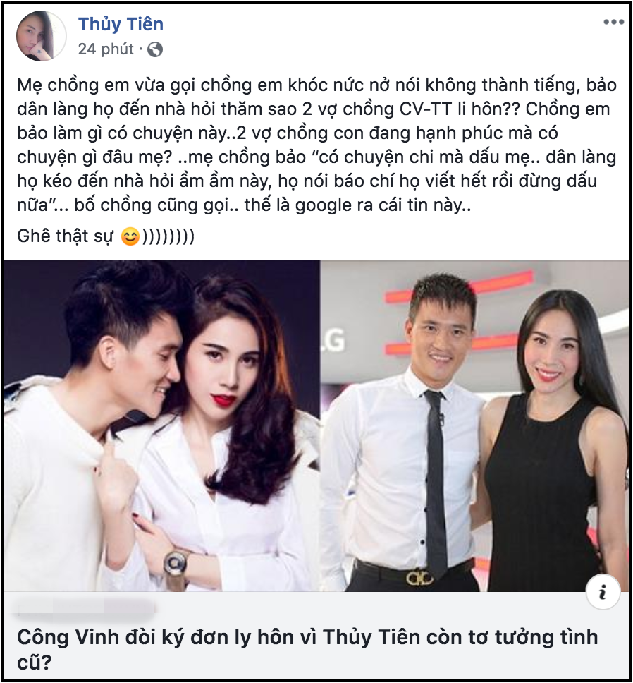 "Mẹ chồng em vừa gọi chồng em khóc nức nở nói không thành tiếng, bảo dân làng họ đến nhà hỏi thăm sao hai vợ chồng Công Vinh - Thủy Tiên ly hôn? Chồng em bảo làm gì có chuyện này, hai vợ chồng con đang hạnh phúc mà có chuyện gì đâu mẹ? Mẹ chồng bảo "có chuyện chi mà dấu mẹ... dân làng họ kéo đến nhà hỏi ầm ầm này, họ nói báo chí họ viết hết rồi đừng giấu nữa"... Bố chồng cũng gọi, thế là google ra cái tin này" - Thủy Tiên viết.