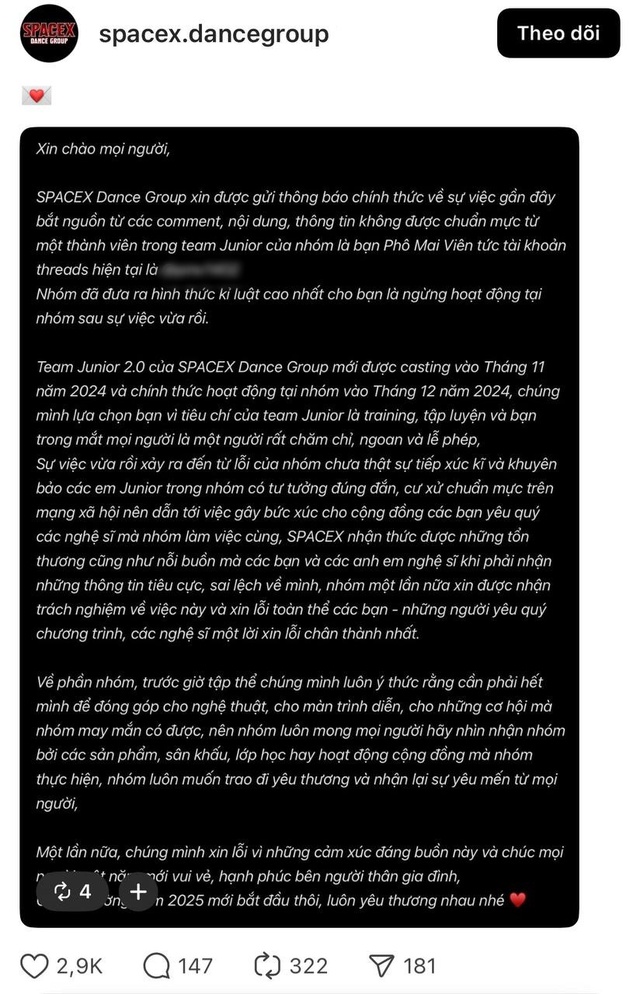 Nghiêm trọng hơn cả cơn bão tẩy chay là việc mới đây, SPACEX Dance Group đã đưa ra thông báo chính thức về trường hợp này. Theo đó, nam dancer có phát ngôn vạ miệng có tên/biệt danh là Phô Mai Viên, hiện tại đã phải chịu mức kỷ luật cao nhất là ngừng hoạt động tại nhóm. Điều này như một gáo nước lạnh dội thẳng vào sự nghiệp chưa kịp có thành tích gì của anh. Trước việc bị vạ lây bởi một thành viên, SPACEX Dance Group cũng phải đưa ra lời xin lỗi vì chưa tiếp xúc kỹ và khuyên bảo các thành viên mới trong việc có tư tưởng đúng đắn, chuẩn mực trên mạng xã hội. Nhóm cũng nhận trách nhiệm về mình và gửi lời xin lỗi đến những người yêu quý các nghệ sĩ.