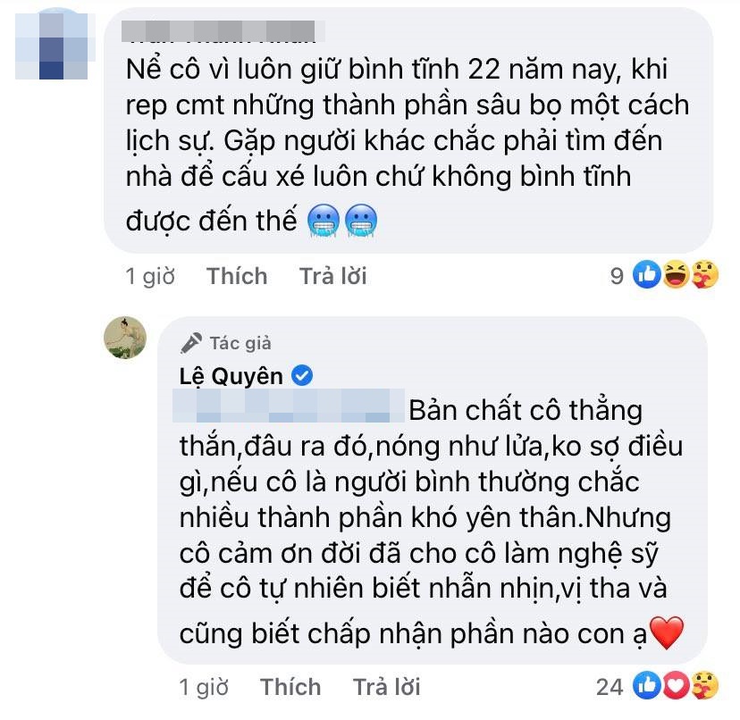 Cuộc chiến giữa Lệ Quyên và anti-fan dường như không có hồi kết khi càng ngày nữ ca sĩ lại càng phản ứng gay gắt trước những bình luận trái chiều về mình. Mới đây, Lệ Quyên còn đi đáp trả từng bình luận để bày tỏ sự phẫn nộ với anti-fan, thậm chí cô còn dùng những lời lẽ mỉa mai, gay gắt.