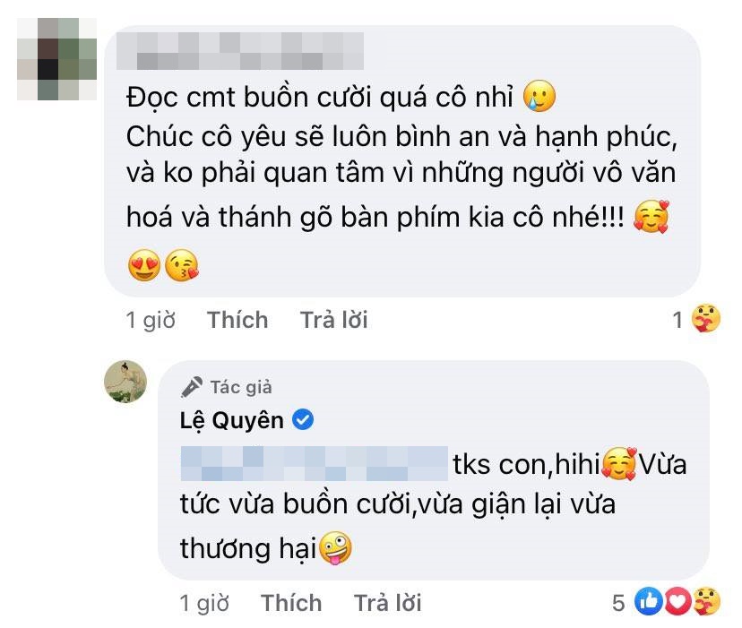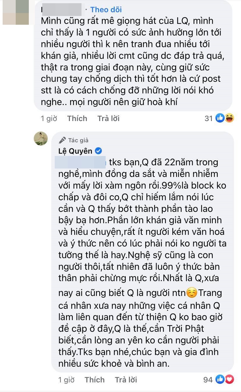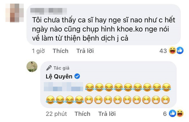 Trong bài đăng mới nhất trên trang cá nhân, Lệ Quyên bị chê: "Ngày nào cũng chụp hình khoe, không làm từ thiện gì cả". Nữ ca sĩ cũng lên tiếng luôn: "Mắc ói vì lũ đạo đức giả leo lẻo không biết ngượng. Chả biết người ta làm gì không, cứ nói nhăn nói cuội linh tinh hết người này đến người kia, nói thẳng vào mặt mà cứ trơ ra nói tiếp".