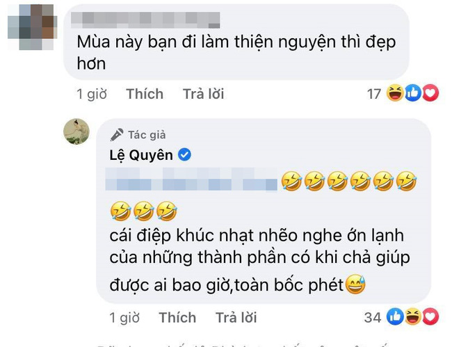 Ngay cả khi chỉ được góp ý nhẹ nhàng: "Mùa này bạn đi làm thiện nguyện thì sẽ đẹp hơn", Lệ Quyên cũng gay gắt phản pháo: "Cái điệp khúc nhạt nhẽo nghe ớn lạnh của những thành phần có khi chẳng giúp được ai bao giờ. Toàn bốc phét".