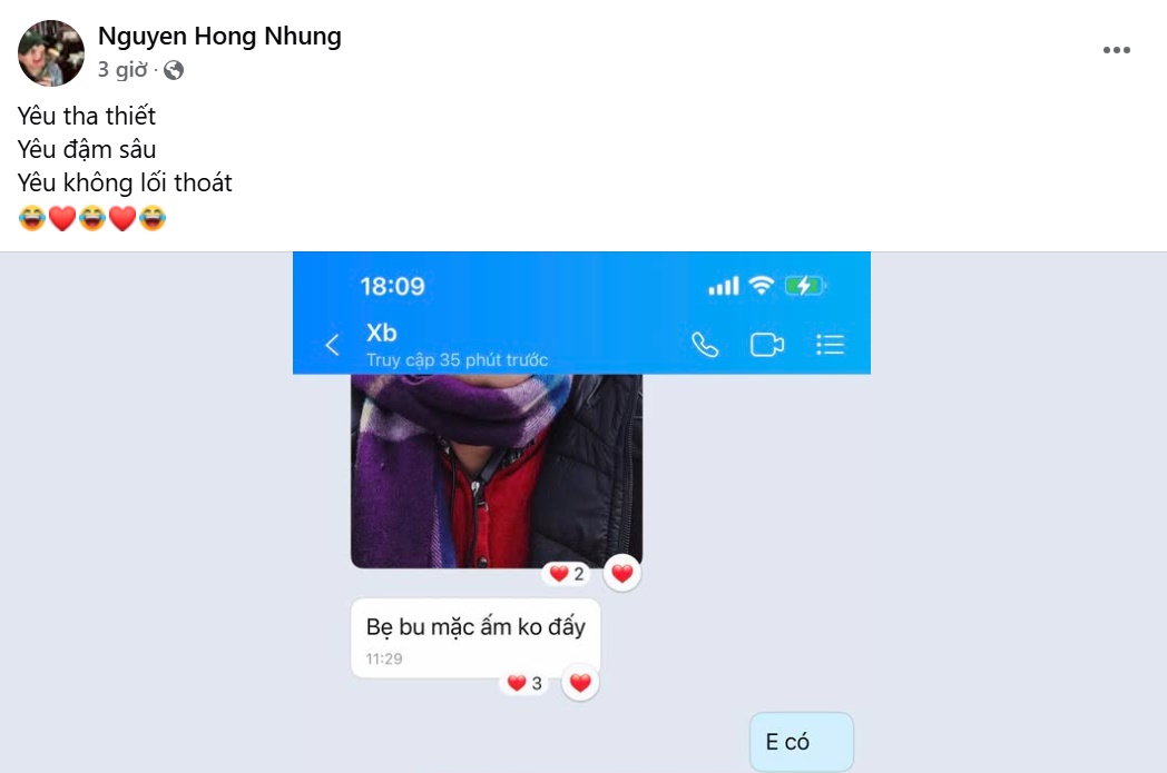 Bà xã Xuân Bắc cũng không giấu được sự tự hào khi được chồng yêu chiều, quan tâm. Chị viết: "Yêu tha thiết, yêu đậm sâu, yêu không lối thoát".