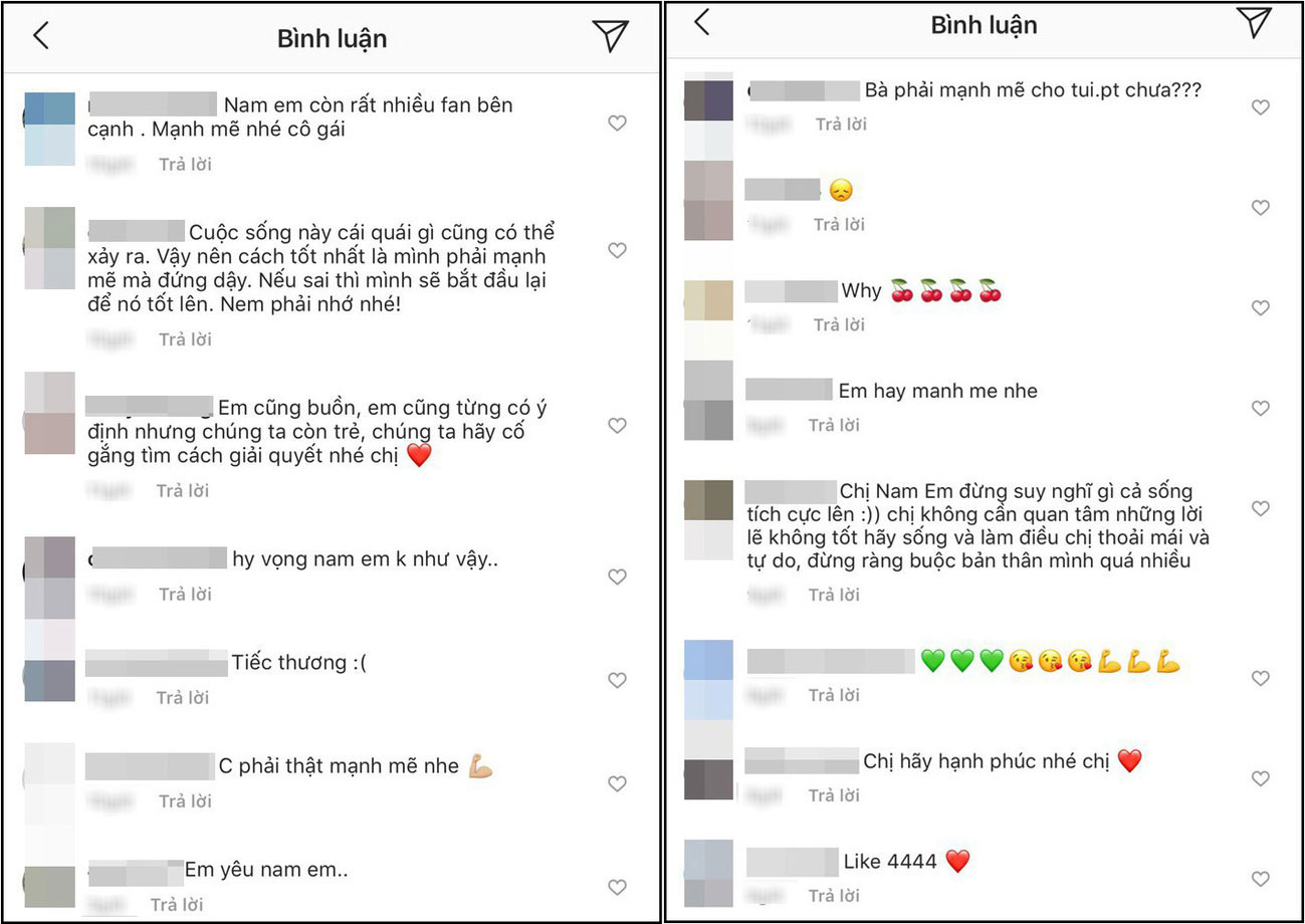 Lời chia sẻ này rất nhanh chóng nhận được sự quan tâm lớn từ cộng đồng mạng. Nhiều khán giả đã vào trang cá nhân của Nam Em để lại lời động viên và khuyên nhủ cô hãy luôn thật mạnh mẽ, sống tích cực dù miệng đời có ác nghiệt đến đâu. "Nam Em còn rất nhiều fan bên cạnh. Mạnh mẽ nhé cô gái", "Bà phải mạnh mẽ cho tui biết chưa?", "Chị Nam Em đừng suy nghĩ gì cả, sống tích cực lên", "Chị phải thật hạnh phúc nhé"... là những bình luận được mọi người liên tục gửi đến Nam Em với mong muốn cô sẽ đọc được chúng.