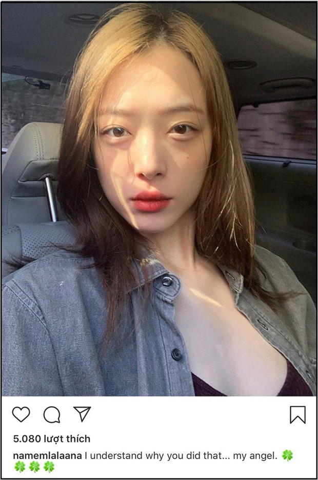 Không chỉ riêng showbiz Hàn mà ở Việt Nam, nhiều người nổi tiếng cũng không khỏi bàng hoàng và xót xa trước cái chết đột ngột của Sulli. Trong vô số những lời chia buồn, cư dân mạng đặc biệt chú ý đến động thái của Nam Em. Ngay sau khi biết tin cựu thành viên f(x) ra đi ở tuổi 25, hoa khôi áo dài đã đăng tải một bức ảnh đời thường của nữ nghệ sĩ lên instagram cá nhân kèm lời nhắn nhủ: "I understand why you did that... My angel" (Tạm dịch: "Tôi hiểu tại sao bạn lại làm như vậy. Thiên thần của tôi").